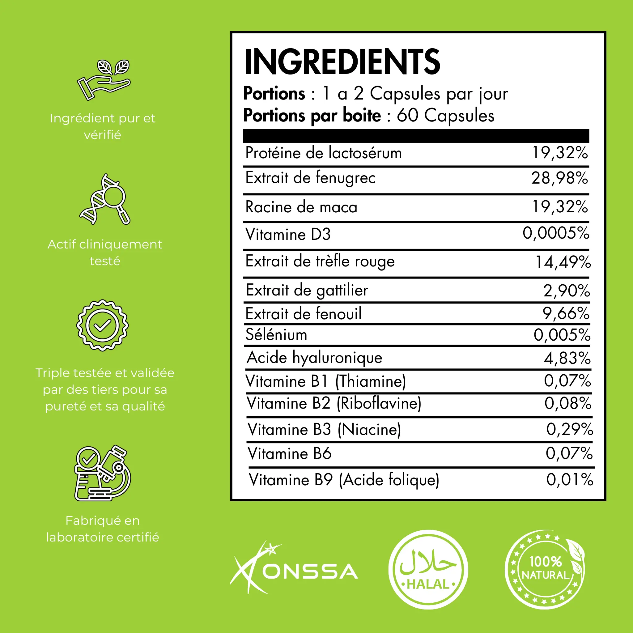 - Extrait de trèfle rouge : Contribue à l’équilibre hormonal et au bien-être global.